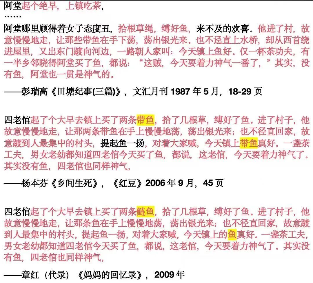 于是我在微信念书里检索了其中一个要道词“老干龙钟”,果然发现用词同样,以及更多重合内容——仅仅有的地点作念了转换,比如原著写槐树,杨本芬改成了樟树。当发现一处抄袭迹象后,当然会思到其他作品是否也有问题。