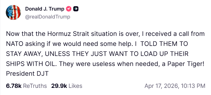好意思国总统特朗普4月17日在外交媒体平台发文说:“霍尔木兹海峡的问题也曾措置了,我(这才)接到北约回电,磋磨我是否需要扶助。”