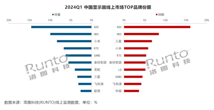 从品牌来看,跟着商场入局者的增加,中国表现器线上商场的蚁合度徐徐镌汰。AOC位居线上商场销量、销额的双线第一,份额均约为15%,略有小幅增长。HKC和小米鉴识位列线上商场的销量第二和第三。在中高端居品线,三星的OLED和Mini LED居品在商场的份额处于最初地位。