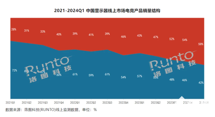 继2023年电子竞技考究成为亚运会比赛项目的里程碑事件之后,电竞在中国商场虚耗电子界限的影响力正在快速扩散。凭证洛图科技(RUNTO)线上监测数据表现,2024年第一季度,中国电竞表现器的零卖量达到121万台,同比高涨24.7%,单季渗入率创下新高,达58%。位居电竞表现器线上零卖商场前三名的品牌鉴识是AOC、HKC和SANC,三者的销量份额均越过10%。相配是SANC手脚后发先至,与旧年同时比较,份额补助了7.6个百分点,展现出苍劲的增长势头。