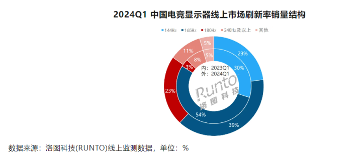 凭证洛图科技(RUNTO)线上监测数据表现,当今电竞表现器的主流刷新率还是165Hz,份额约在40%,但同比着落近15个百分点。与此比较,180Hz居品的增长势头最为蛮横,份额较同时高涨了20个百分点。