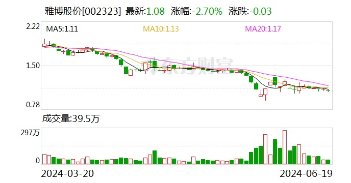 中证智能财讯 雅博股份(002323)6月19日晚间公告,截止2024年6月19日,公司控股激动山东泉兴科技有限公司已通过相聚竞价交往格式累计增抓公司股份2314.93万股,占公司总股本比例1.0915%,累计增抓金额2567.22万元。