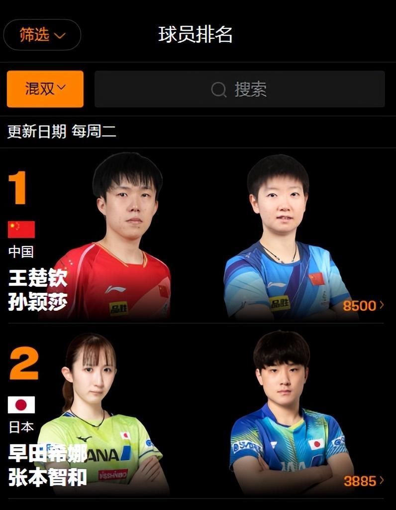 混双天下名次积分,王楚钦/孙颖莎高达8500分,随后是张本智和/早田希娜,惟有3885分,也即是说,天下第1的积分和天下第2的积分差了一倍多。