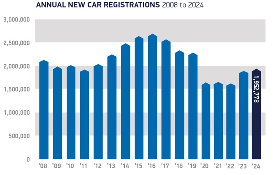 把柄SMMT的数据,2024年12月,英国新车注册量同比微跌0.2%至140,786辆;2024年全年,英国的新车注册量同比增长2.6%至1,952,778辆。其中,车队的年度注册量同比高潮11.8%至1,163,855辆,商场份额近60%;个东谈主用户的注册量同比下滑8.7%至746,276辆,低于2020年的注册量。