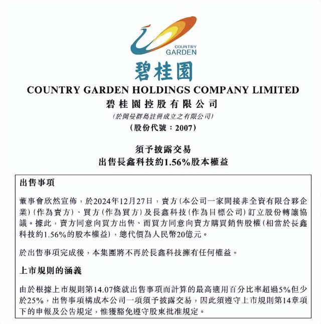 12月27日晚间,碧桂园发布公告称,旗下一家曲折非全资有限结伴企业与行为买方的合肥建长股权投资结伴企业(有限结伴)及长鑫科技(行为指标公司)共同签订股份转让条约。